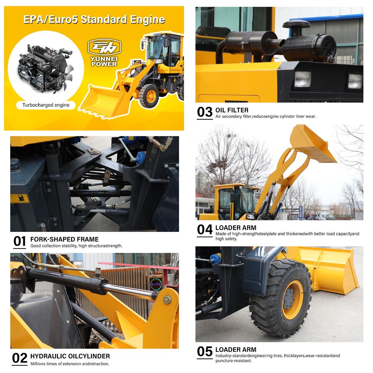 Equipped with a 20.1 kW engine and 2300 kg operating weight, it ensures long-term durability and low maintenance. 1000-16 tires and a robust structure cut downtime, making it cost-effective for heavy-duty use.